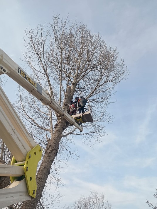 Potatura e abbattimento piante con gru e cesta elevatrice